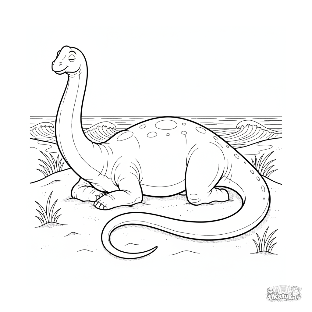 Página para colorir para 7-9 anos: um apatossauro massivo descansando pacificamente em uma duna de areia quente com vista para o oceano antigo. Proporções realistas.