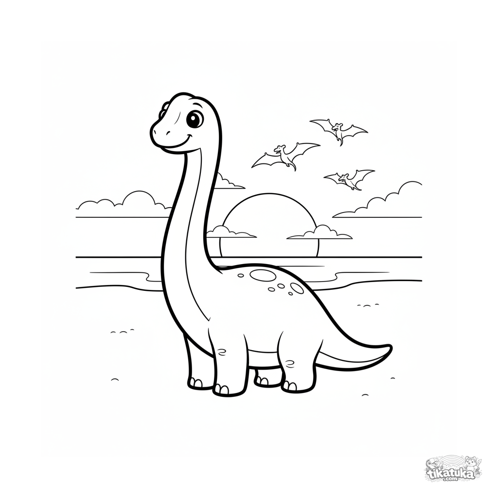 Página simples para colorir para crianças pequenas 2-3: um enorme apatossauro na praia observa o pôr do sol sobre o oceano antigo.