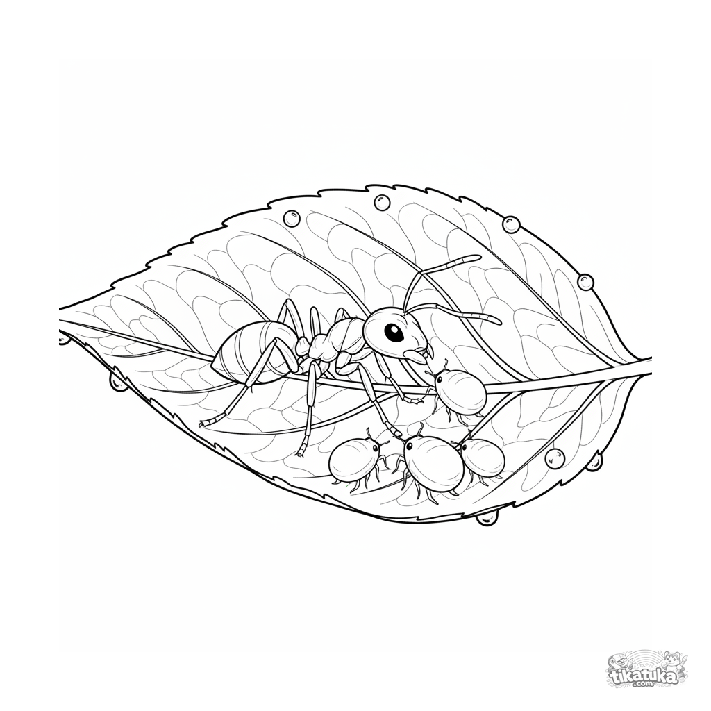 Página para colorir complexa para crianças mais velhas de 10-12 anos: uma formiga pastoreia pulgões na parte inferior de uma folha com orvalho. Trabalho de linha detalhado, estilo naturalista, múltiplos elementos.