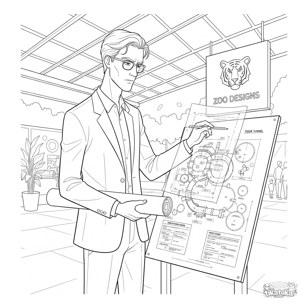 Página para colorir detalhada para crianças de 10-12 anos. Um arquiteto de óculos desenha numa sobreposição transparente da planta de um novo recinto de tigres.