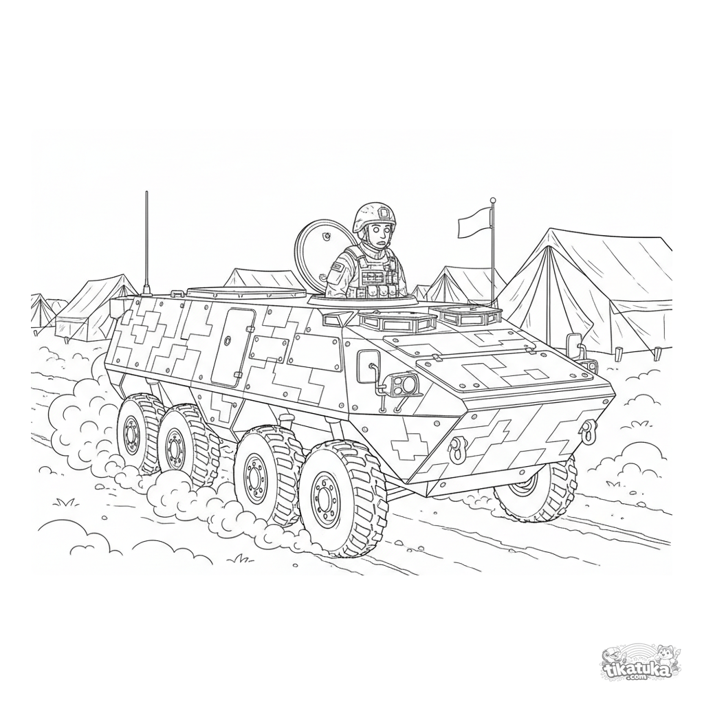 Página para colorir detalhada para crianças mais velhas de 10-12 anos: um transporte blindado de pessoal moderno chega ao quartel-general de campo. Um soldado espreita pela escotilha, observando as barracas.