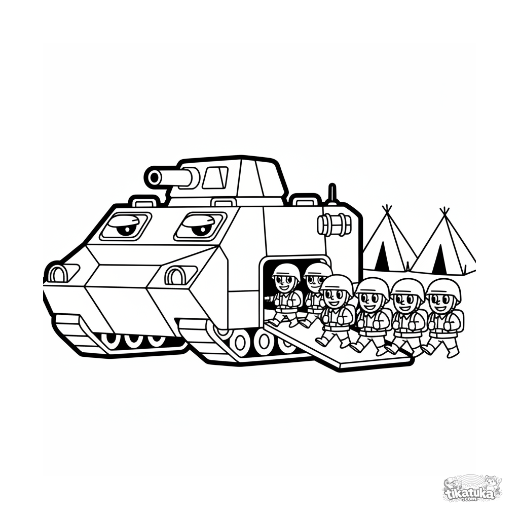 Página para colorir para bebês 2-3: um transporte blindado grande com rampa baixa desembarca soldados em um acampamento. Formas simples, esteiras.