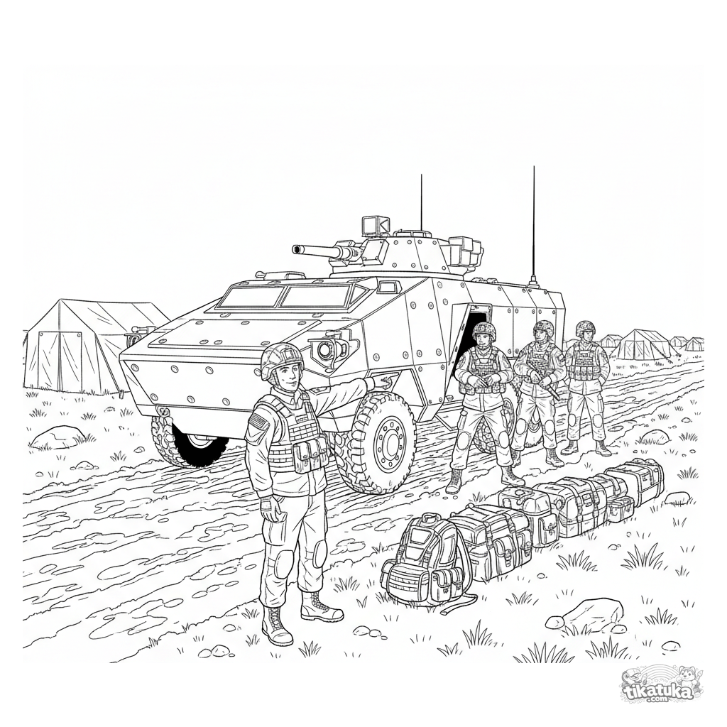 Página detalhada para colorir de um APC chegando ao QG de campo. Para crianças mais velhas 10-12 anos. Soldados desembarcando, rampa abaixada, inclui barracas e equipamento.