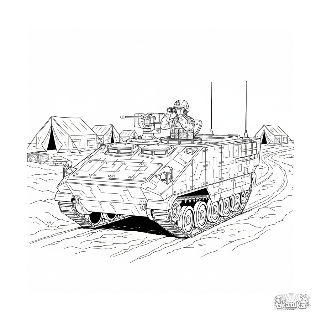 Página para colorir complexa para crianças mais velhas de 10-12 anos: um transporte blindado de pessoal detalhado em patrulha perto do QG de campo. Camuflagem realista, detalhes técnicos.