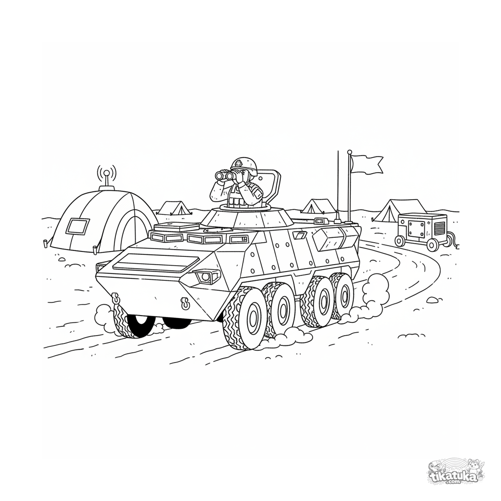 Página para colorir para crianças de 7-9 anos: um transporte blindado de pessoal moderno patrulhando lentamente o perímetro de um quartel-general de campo. Um soldado na escotilha observa com binóculos.