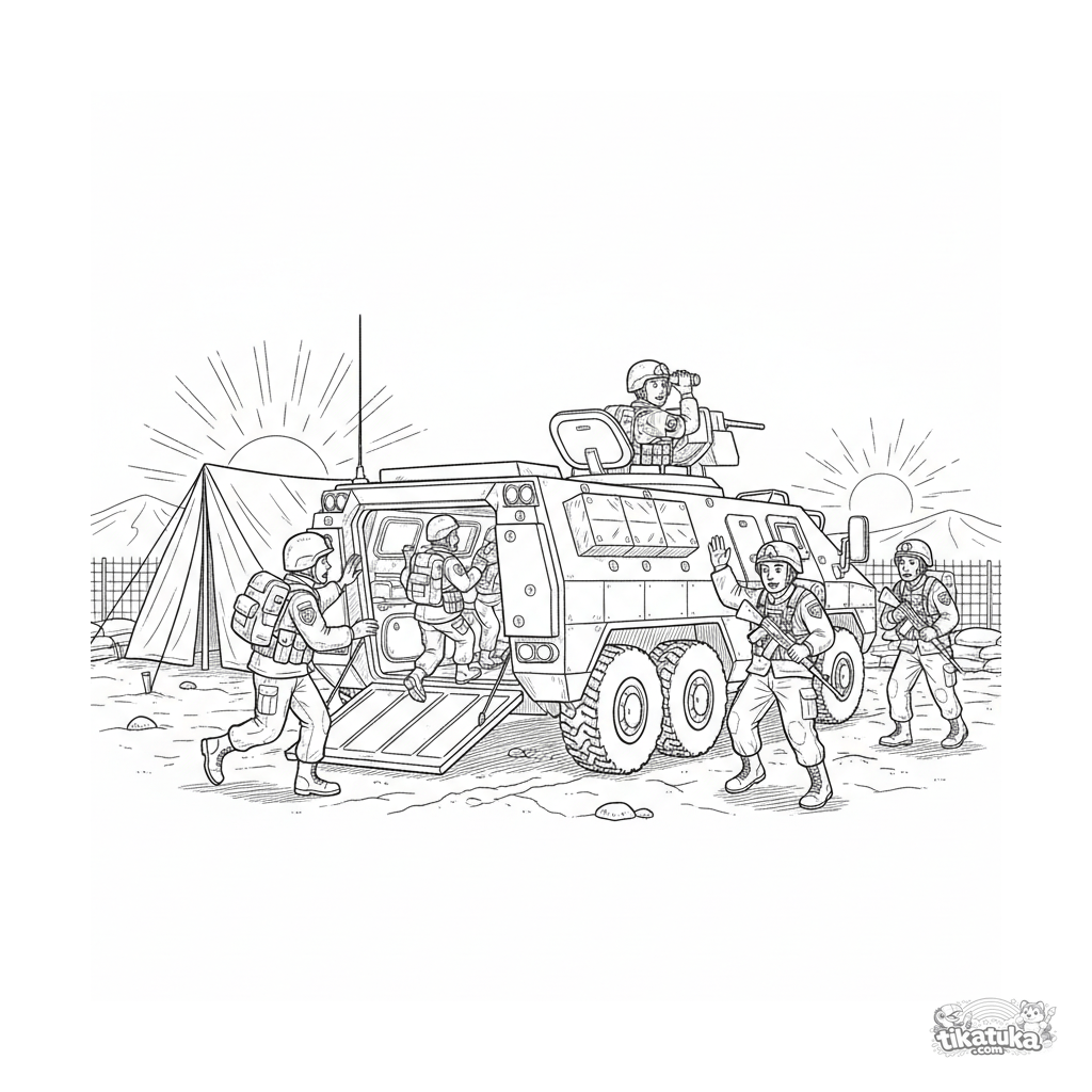 Página para colorir para crianças 7-9: um transporte blindado desembarcando tropas no perímetro do quartel-general de campo.