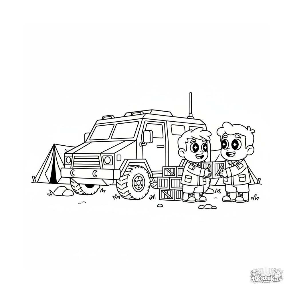 Página para colorir para crianças de 4-6 anos: um caminhão blindado descarregando caixas de suprimentos perto do quartel-general de campo. Cena divertida para meninos.