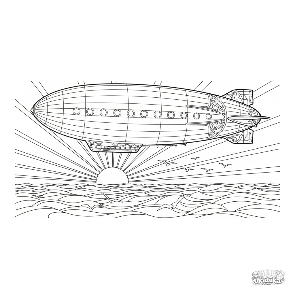 Página para colorir para crianças maiores de 10 a 12 anos: um majestoso zepelim de passageiros art déco da década de 1930 desliza suavemente sobre um vasto oceano ao pôr do sol, com fileiras de janelas de observação.