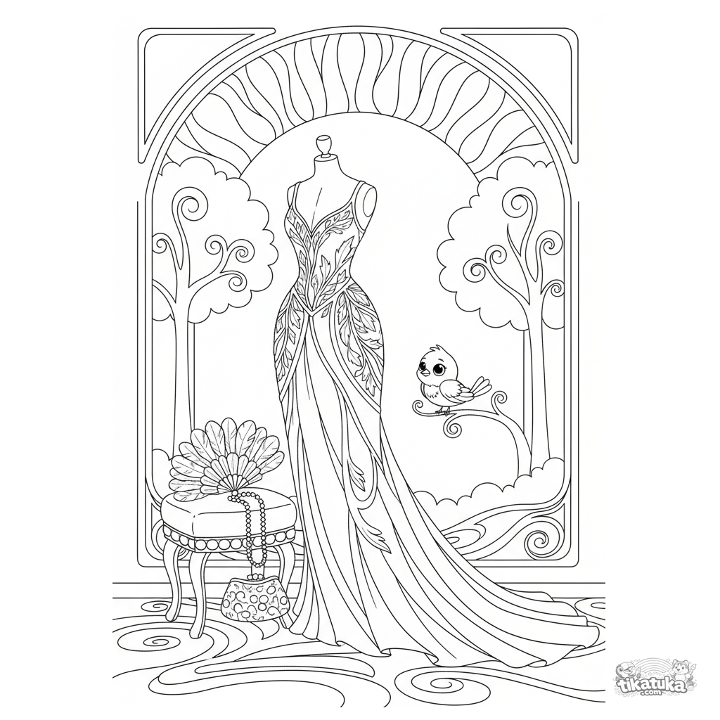 Página para colorir para 10-12 anos: um vestido de baile Art Nouveau elegante em um manequim de vitrine. Linhas fluidas, motivos florais e acessórios combinando.