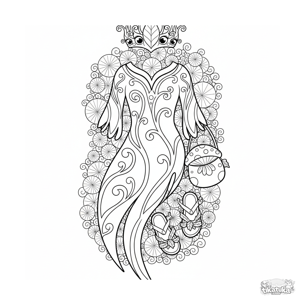 Página para colorir para meninas 10-12: uma apresentação plana detalhada de uma fantasia de túnica de fada da floresta em estilo Art Nouveau.