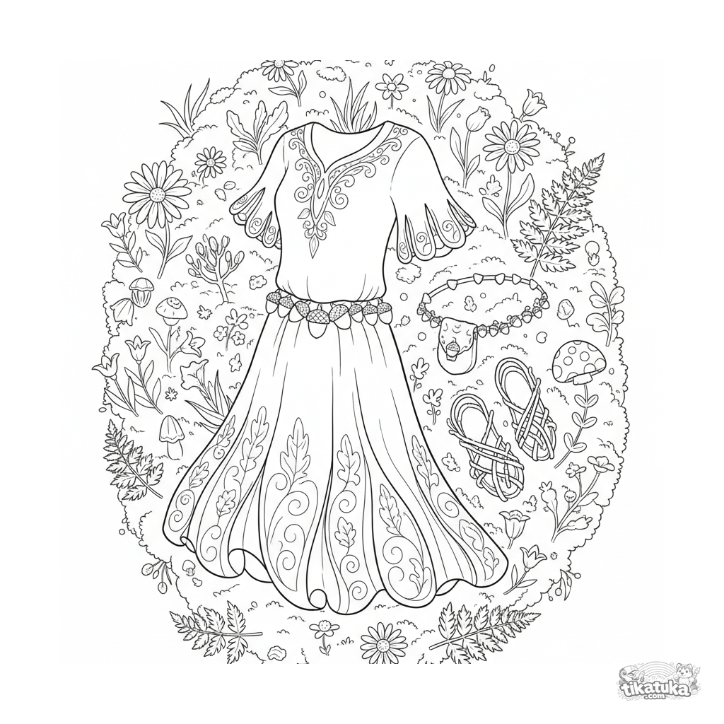 Página para colorir para 10-12 anos: vestuário mágico de fada da floresta em estilo Art Nouveau, disposto sobre musgo com acessórios.