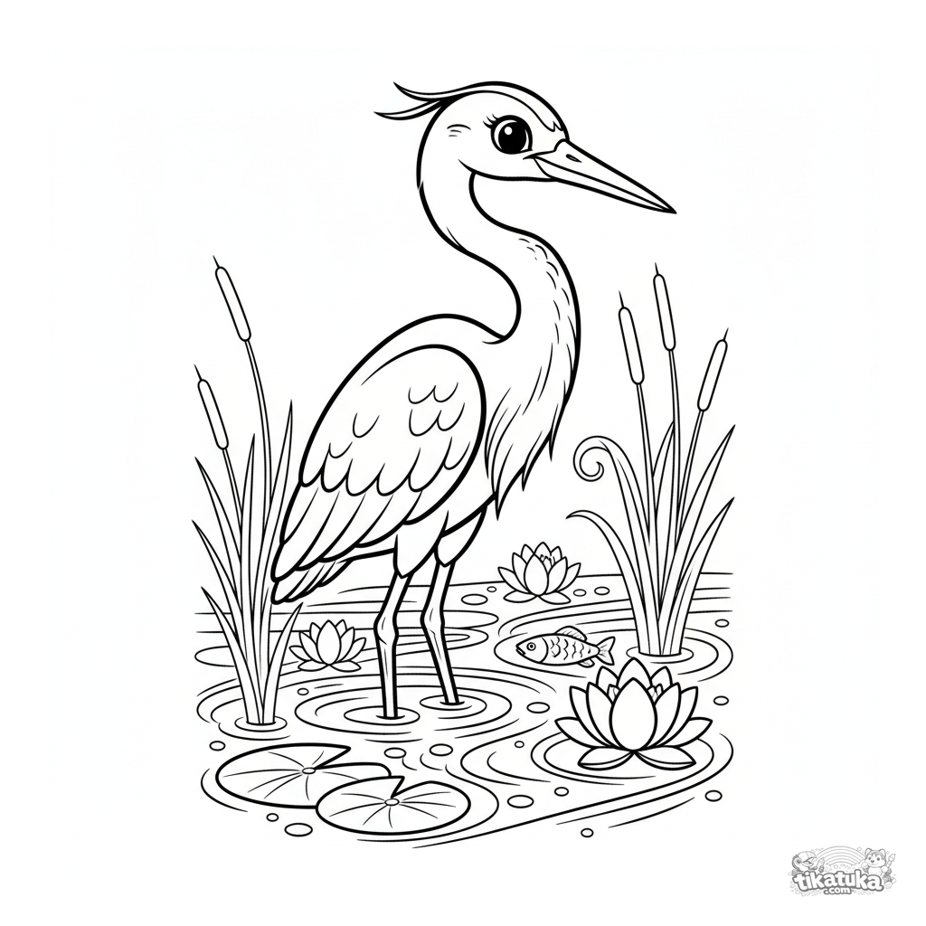 Página para colorir para 7-9 anos no estilo art nouveau: uma garça graciosa entre juncos à beira de um riacho. Linhas decorativas, vitórias-régias e ondulações.