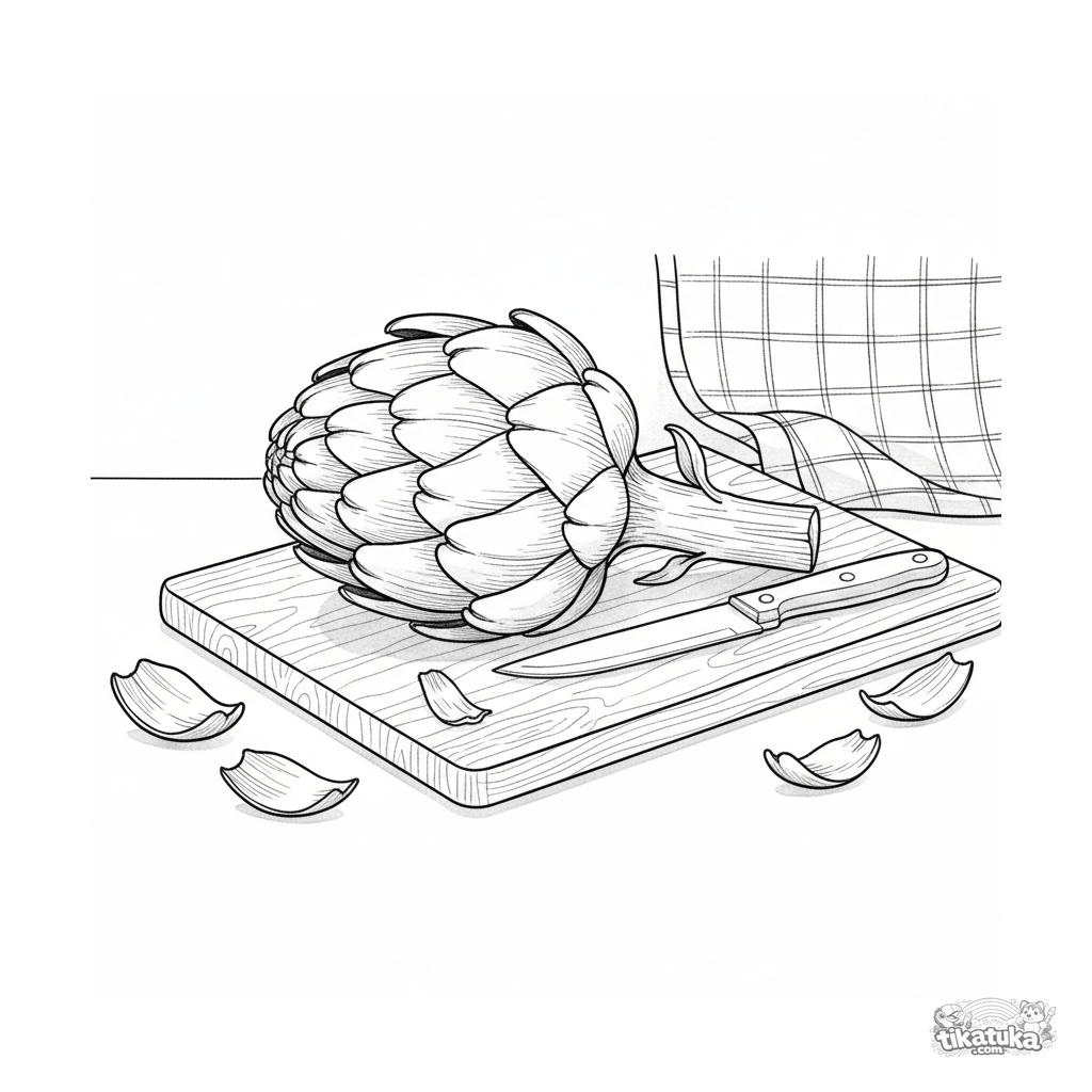 Página detalhada para colorir de uma alcachofra em uma tábua de corte em uma cozinha. Para crianças de 10-12 anos. Estilo realista de aquarela-esboço.