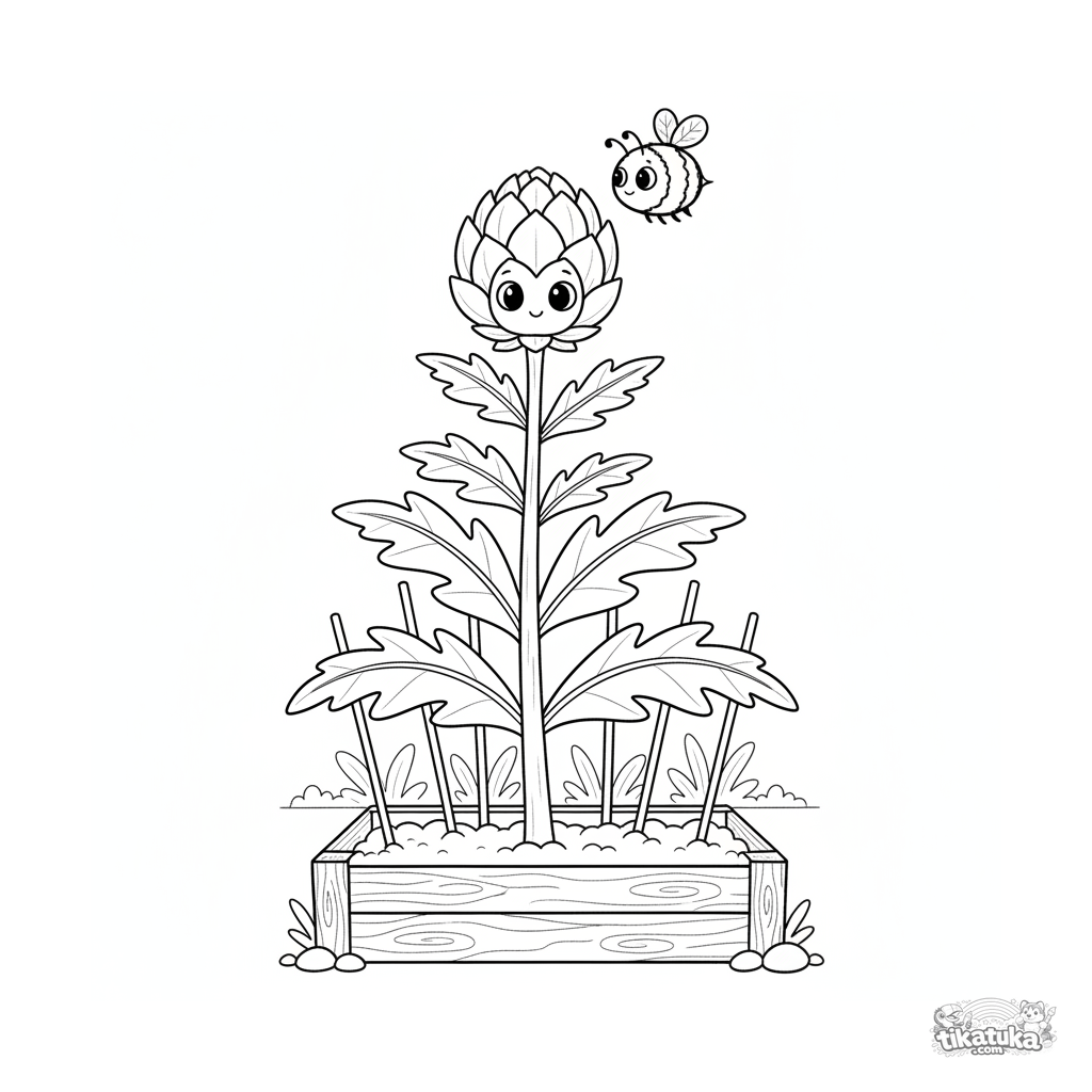 Página para colorir para 7-9 anos: uma alcachofra cresce em um canteiro elevado com uma abelha visitante. Detalhe moderado, estilo aquarela.
