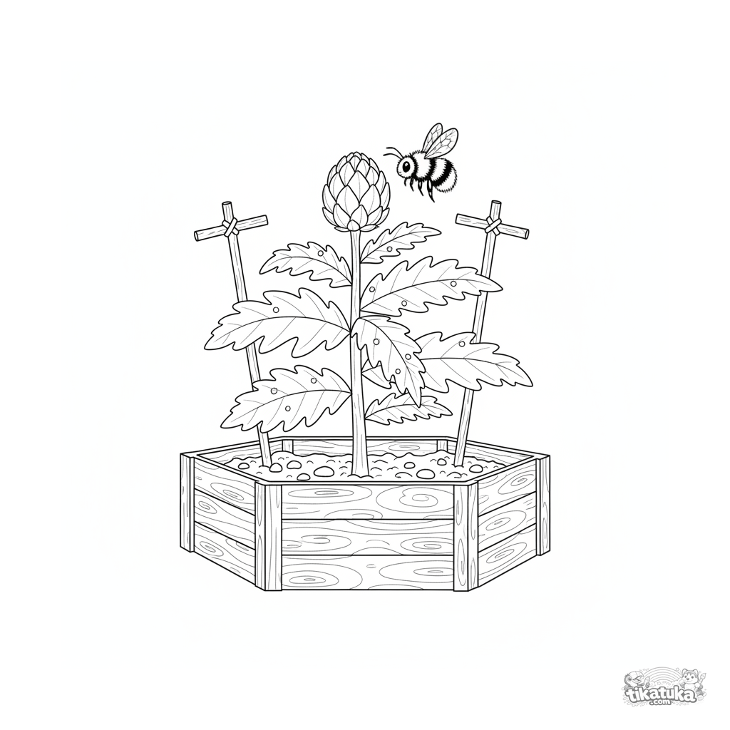 Página para colorir para crianças de 4-6 anos: uma planta de alcachofra crescendo em um canteiro com gotas de orvalho e um zangão. Contornos claros.