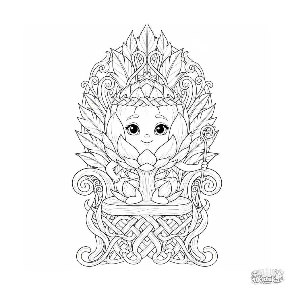 Página para colorir detalhada no estilo art-nouveau: um rei alcachofra em um trono de folhas. Para pré-adolescentes que gostam de padrões intrincados.
