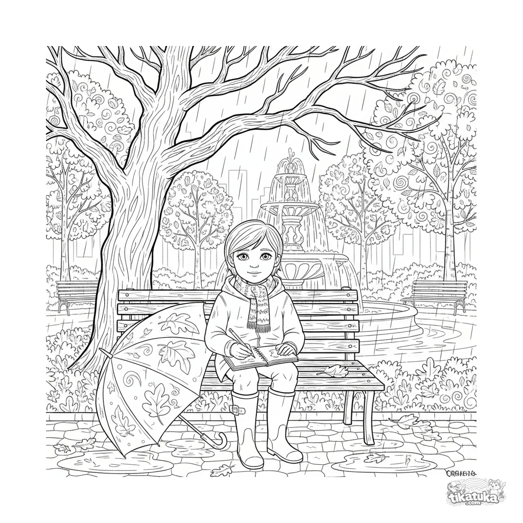 Página para colorir detalhada para crianças mais velhas de 10-12 anos: um artista em um banco de parque desenha em um dia chuvoso de outono. Cena em camadas com fundo e texturas.
