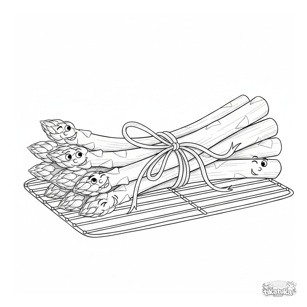 Página complexa para colorir para crianças 10-12: um feixe realista de aspargos amarrado com cebolinha em uma grelha de jardim. Texturas, linhas detalhadas.