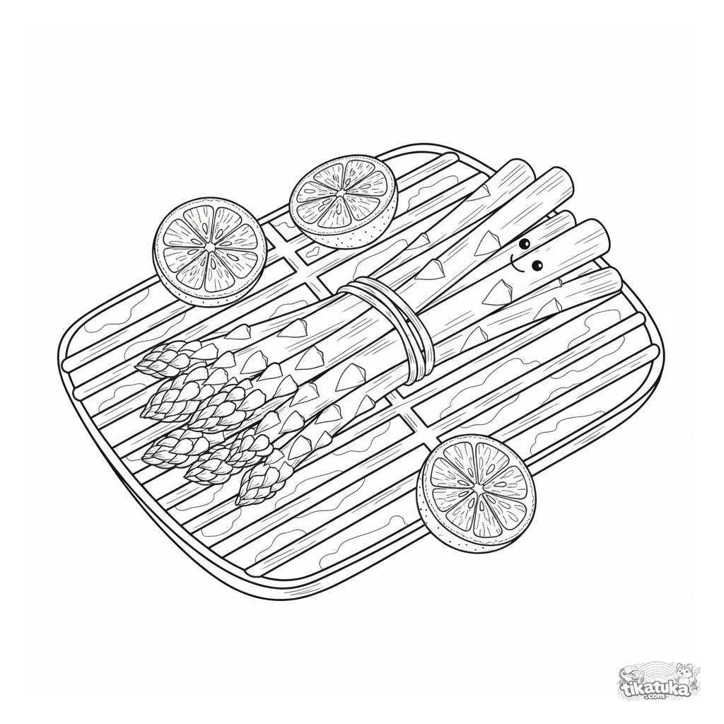 Página para colorir detalhada de um feixe de aspargos grelhados em um jardim. Amarrado com cebolinha. Para crianças de 10 a 12 anos.