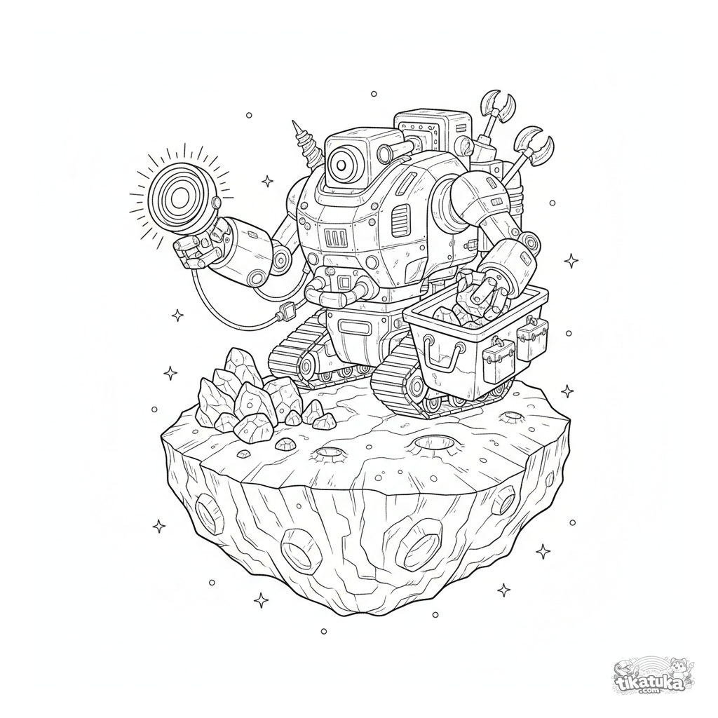 Página difícil para colorir para meninos de 7-12 anos: um robô industrial detalhado trabalha em um asteroide, classificando rochas espaciais. Estilo realista com muitos detalhes mecânicos.