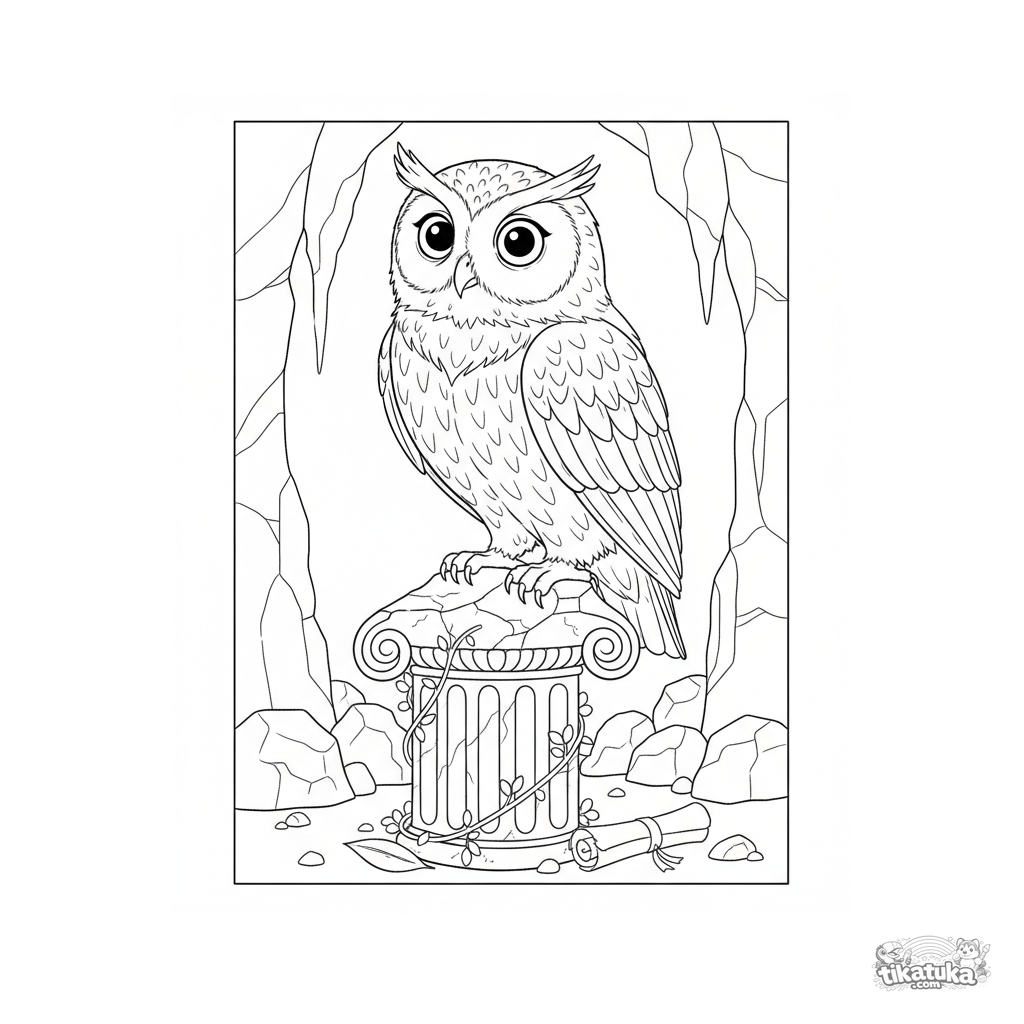 Página para colorir para crianças de 10-12 anos: ilustração detalhada da coruja sagrada de Atenas empoleirada em uma coluna na toca da Medusa. Estilo realista.