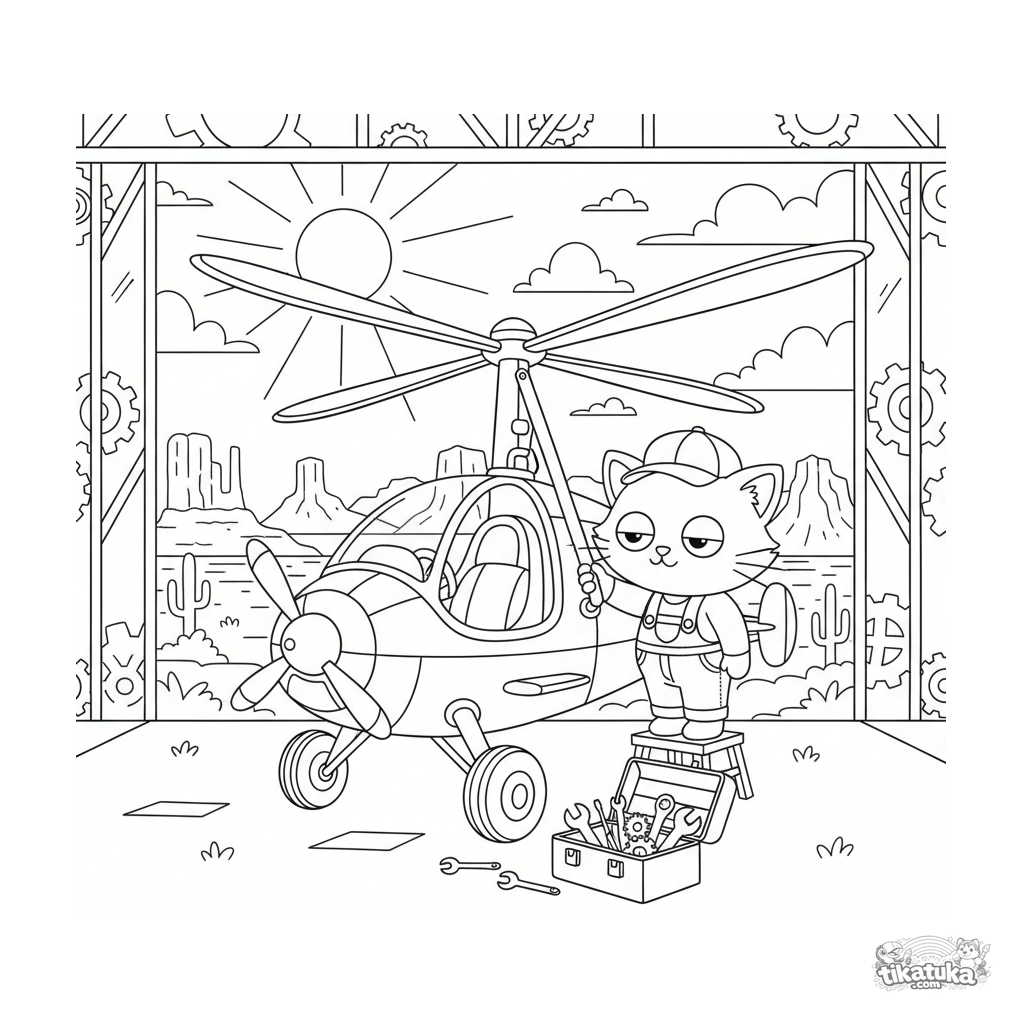 Página para colorir detalhada de um autogiro vintage num hangar desértico. Para 10-12 anos. Um gato mecânico verifica as pás.