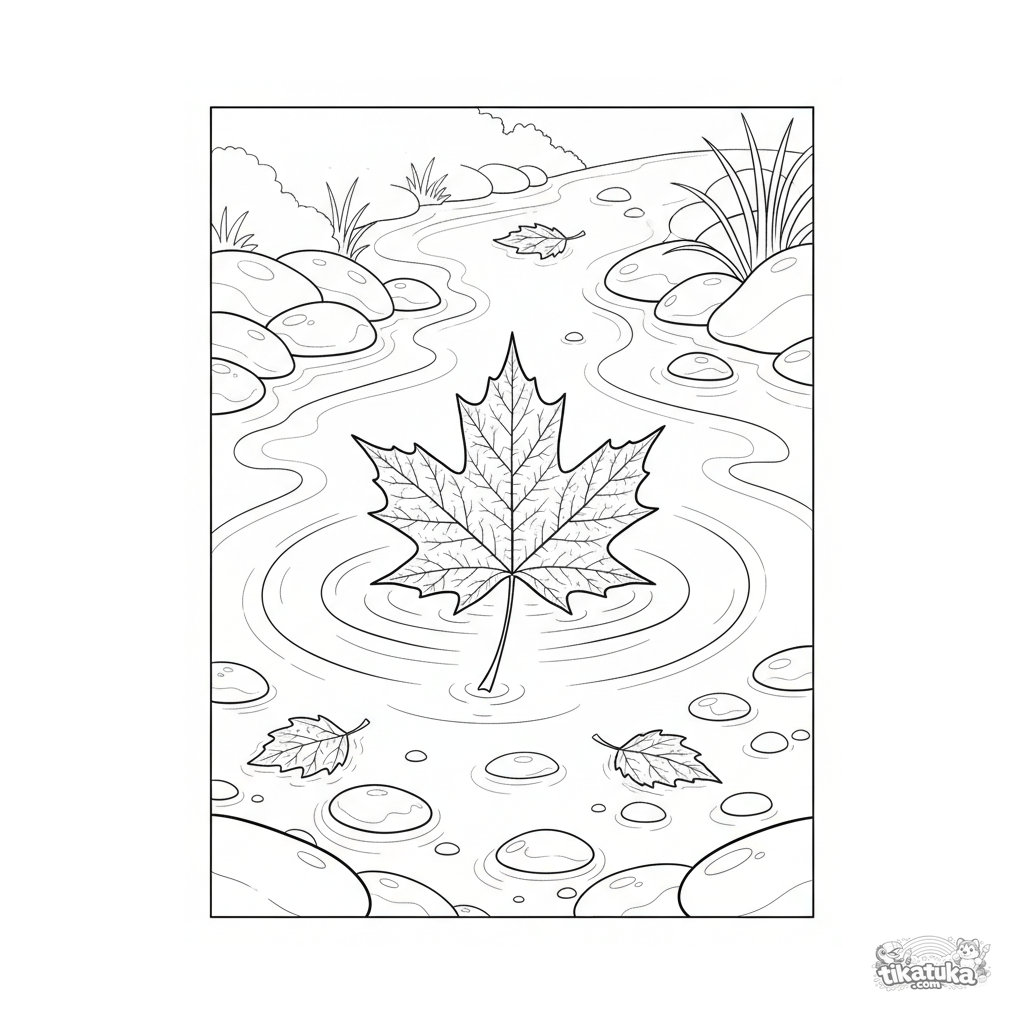 Página para colorir para 7-9 anos: uma folha de bordo grande e com veias flutua na correnteza de um riacho claro de outono. Ilustração detalhada da natureza outonal.