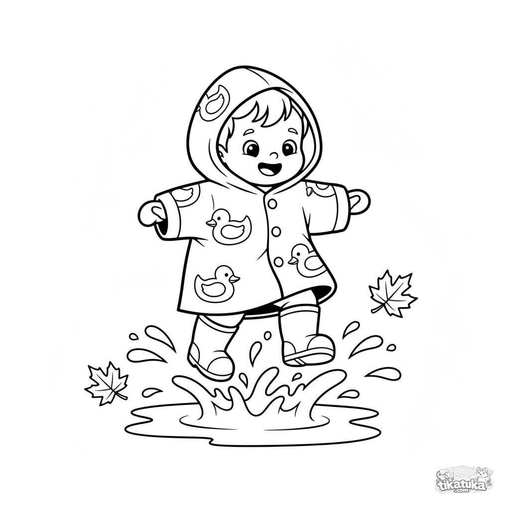 Página para colorir para crianças de 2-3 anos: uma criança alegre com botas de chuva pula em uma poça de outono. Formas simples, margens amplas.