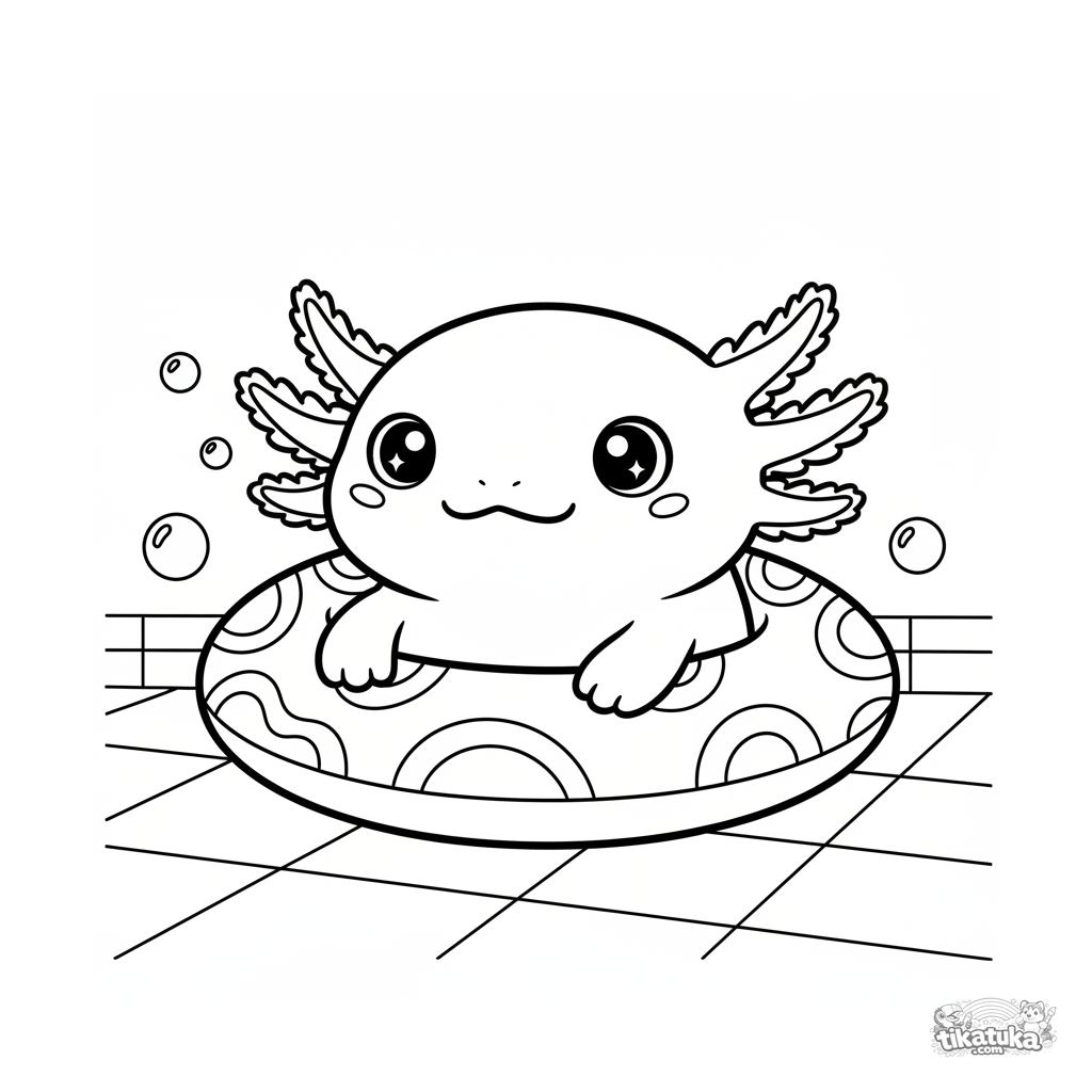 Página para colorir para crianças de 4-6 anos: um axolote fofo descansa em um anel inflável no fundo de uma piscina. Linhas claras e simples, expressão doce.