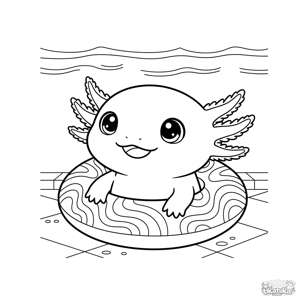 Página para colorir de um axolotle fofo sentado em um anel inflável no fundo de uma piscina. Para crianças de 4 a 6 anos.