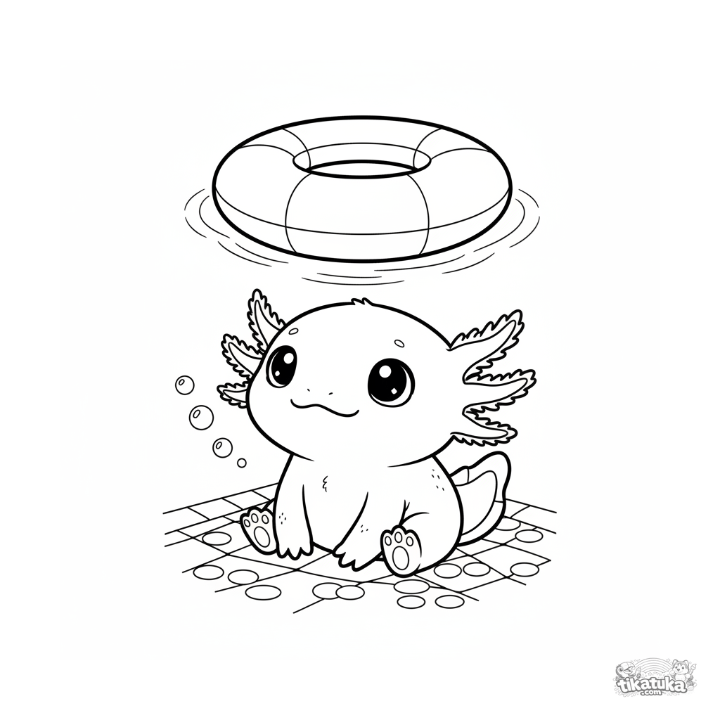 Uma página para colorir de Axolotes e água kawaii com nível Médio. Ela combina com a idade 4-6 anos, imprime bem em casa e abre imediatamente no modo online.