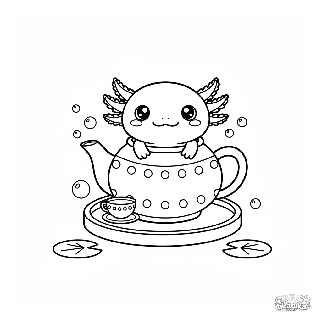 Uma página para colorir de Axolotes e água kawaii com nível Fácil. Ela combina com a idade 2-3 anos, imprime bem em casa e abre imediatamente no modo online.