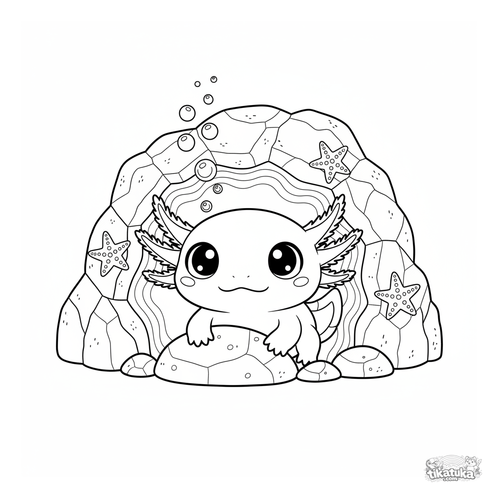 Uma página para colorir de Axolotes e água kawaii com nível Difícil. Ela combina com a idade 7+ anos, imprime bem em casa e abre imediatamente no modo online.