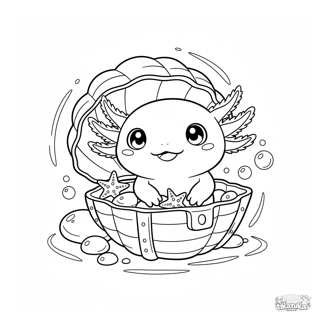 Página para colorir para crianças: um fofo axolotle sorridente com brânquias penugentas espiando de uma grande concha que parece um baú do tesouro.