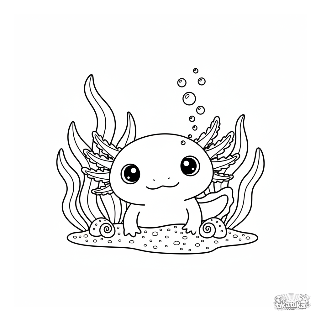 Página kawaii para colorir axolotle: um axolotle rosa curioso espreita por trás de algas e conchas num fundo arenoso. Bolhas, texturas suaves, estilo adesivo.