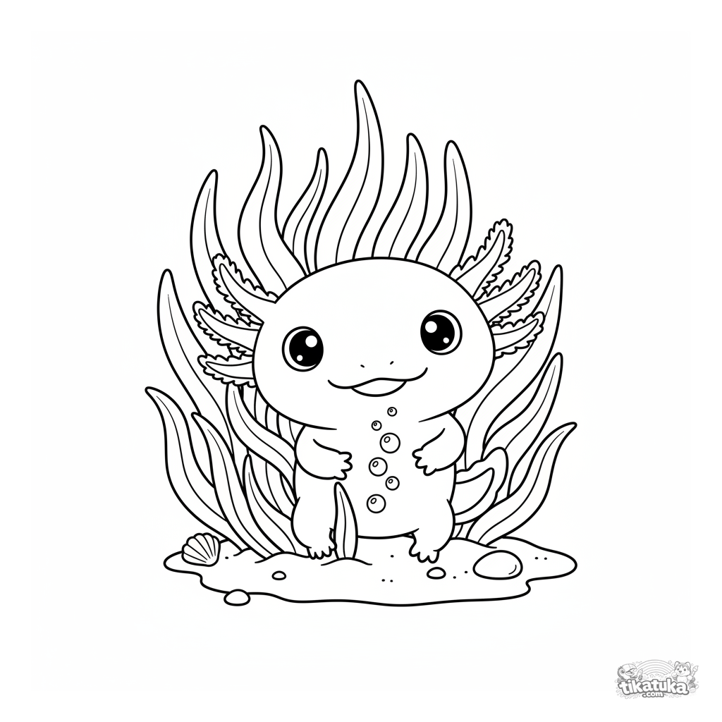 Página para colorir para crianças 4-6: um axolotle rosa fofo com brânquias penugentas espreita timidamente de trás de algas longas, soprando uma corrente de bolhas.
