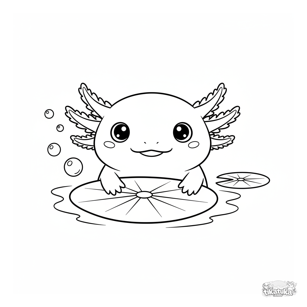 Uma página para colorir de Axolotes e água kawaii com nível Médio. Ela combina com a idade 4-6 anos, imprime bem em casa e abre imediatamente no modo online.