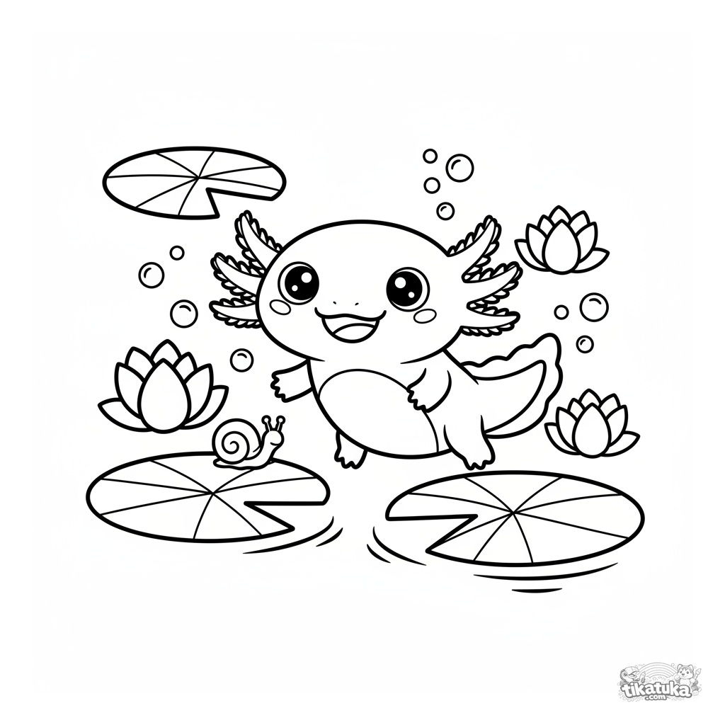 Uma página para colorir de Axolotes e água kawaii com nível Fácil. Ela combina com a idade 2-3 anos, imprime bem em casa e abre imediatamente no modo online.