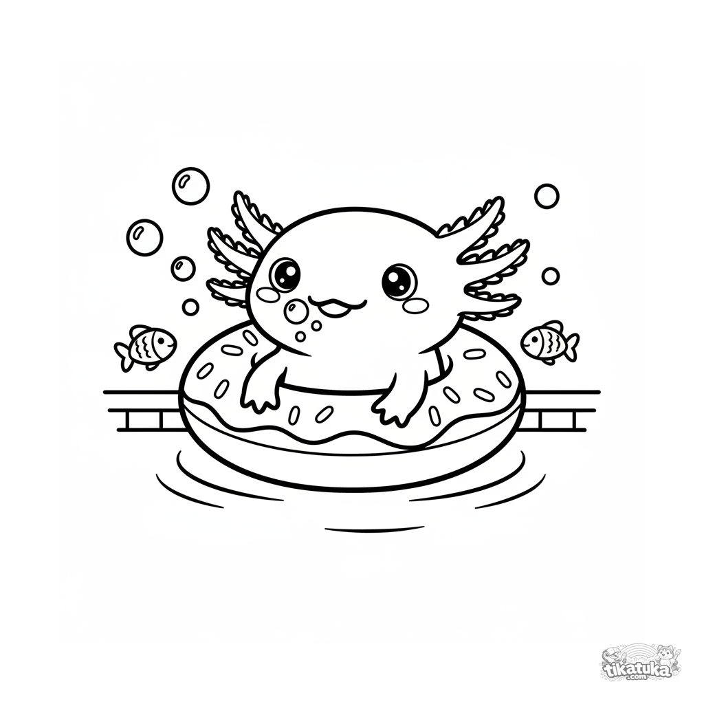 Página para colorir para crianças 4-6: um fofo axolote em uma boia no fundo da piscina faz bolhas. Contornos simples, margens amplas.