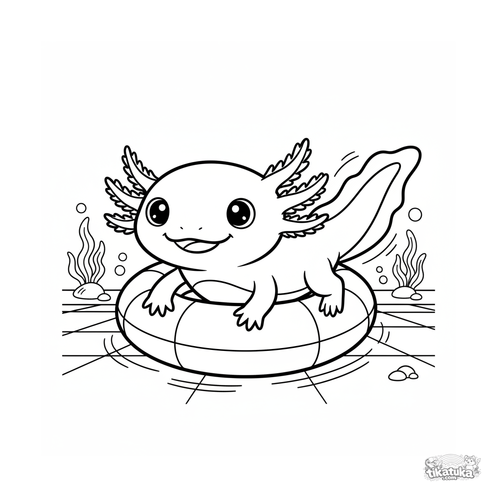 Página para colorir para crianças de 4-6 anos: um fofo axolotle nadando através de um anel inflável no fundo de uma piscina.