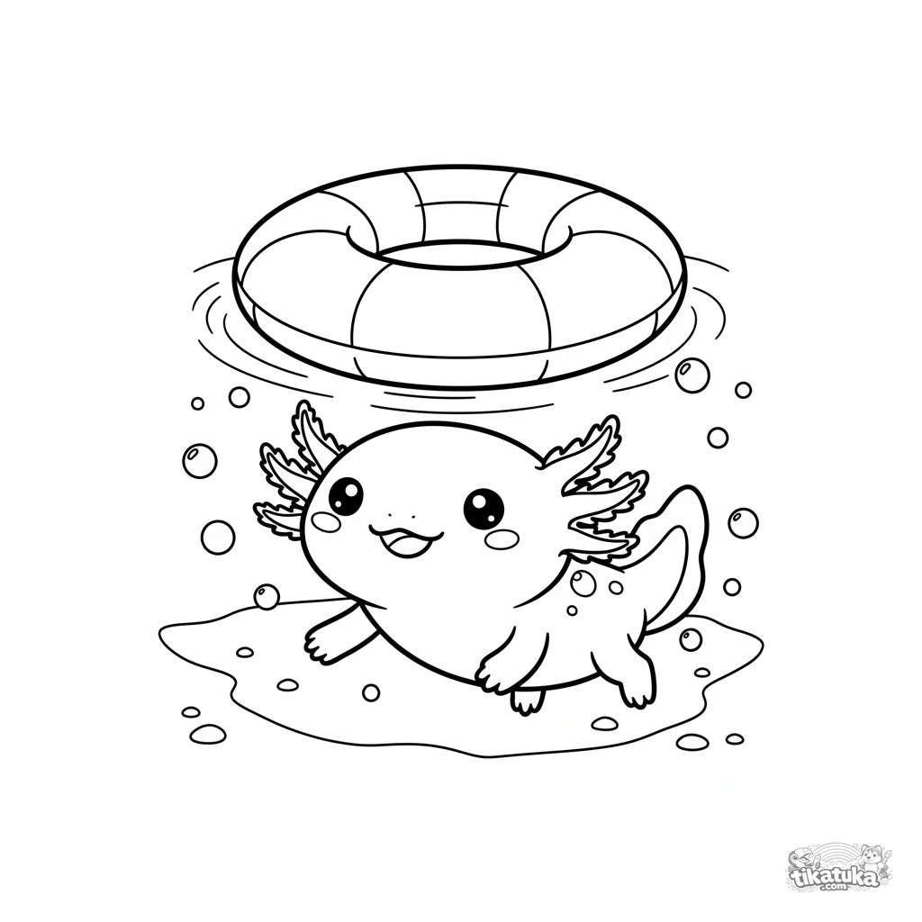 Página para colorir para crianças de 4-6 anos: um axolotle sorridente nada sob um anel inflável no fundo da piscina. Traços fofos e bolhas para colorir.