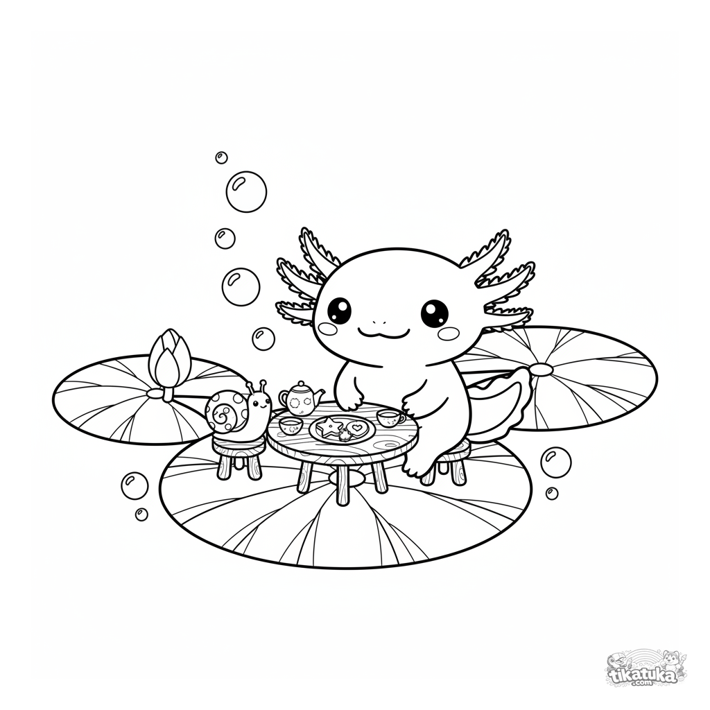 Página para colorir kawaii para crianças de 4-6 anos: um axolotle sorridente organiza uma festa do chá delicada em uma vitória-régia gigante para seus amigos insetos.