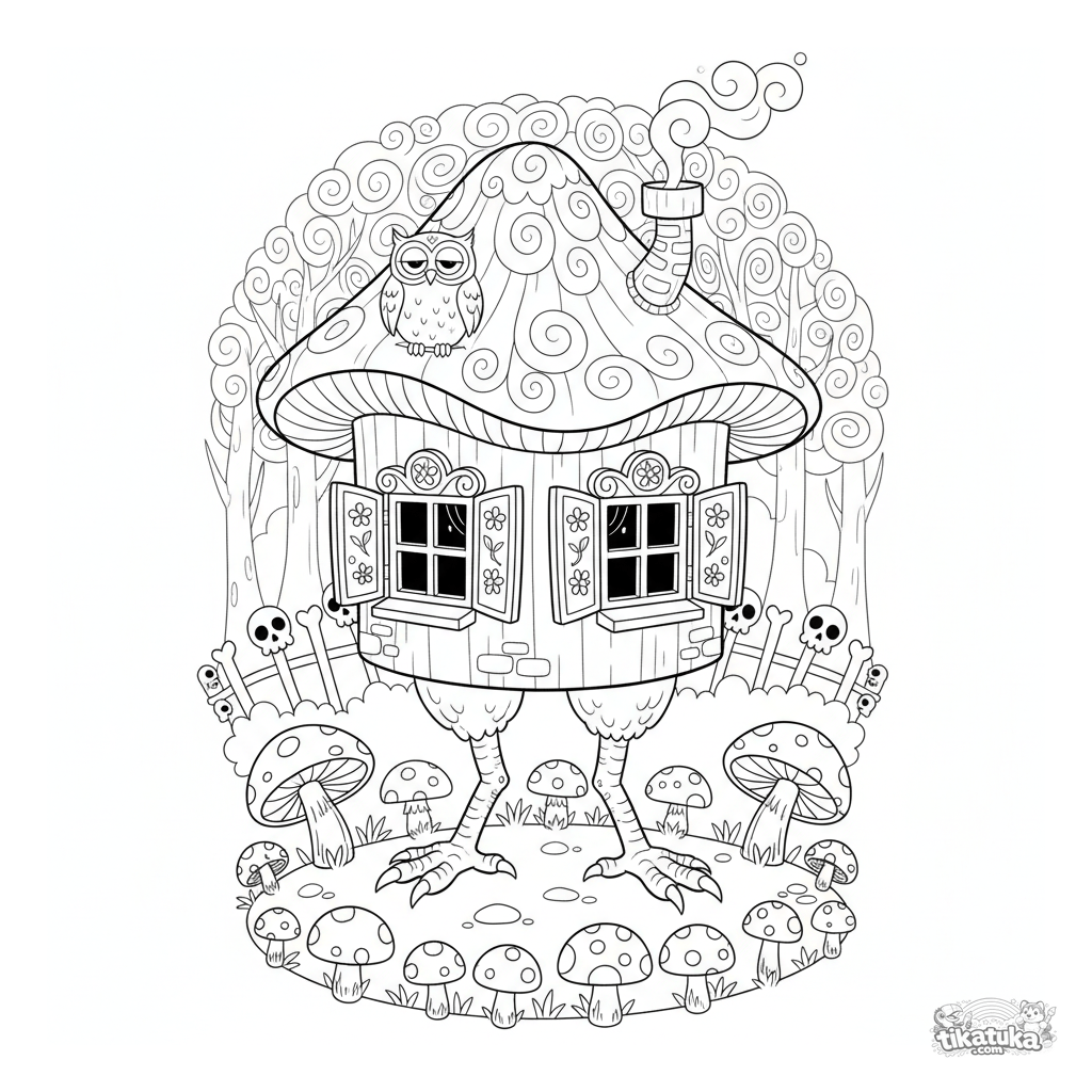 Página difícil para colorir para crianças de 7-12 anos: a cabana mágica da Baba Yaga sobre pés de galinha descansa em uma clareira na floresta, cercada por um anel de cogumelos. Cena detalhada de um conto de fadas russo.