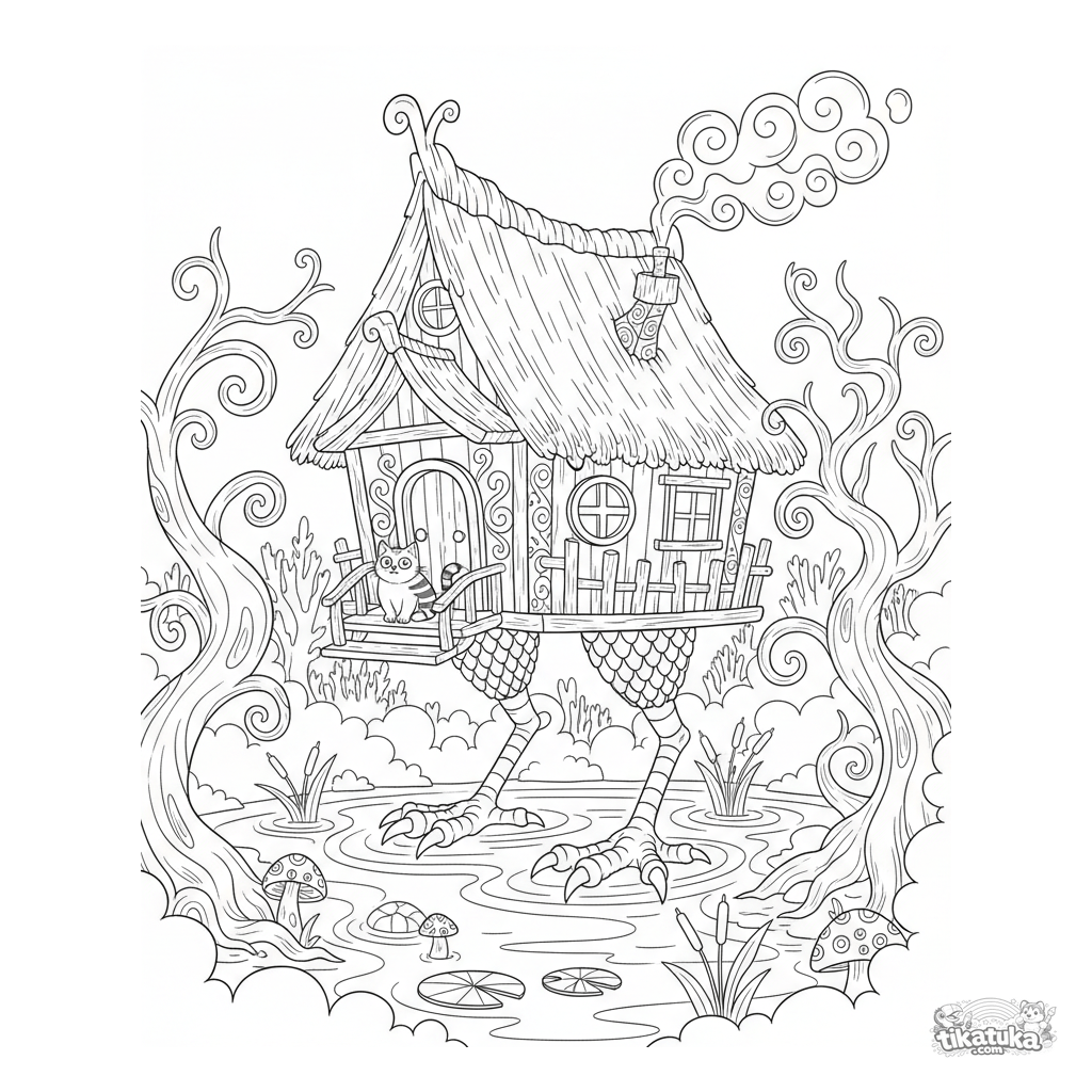 Página para colorir de um conto russo: a cabana da Baba Yaga sobre pernas de galinha em um pântano. Para crianças de 7-12 anos. Crepúsculo, névoa, árvores tortas e um gato.