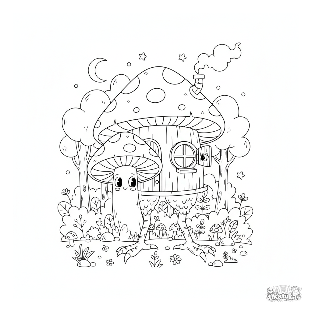 Página para colorir para crianças 4-6 anos de um conto russo: a cabana da Baba Yaga com pernas de galinha espreita atrás de um cogumelo gigante na floresta. Cena icônica.