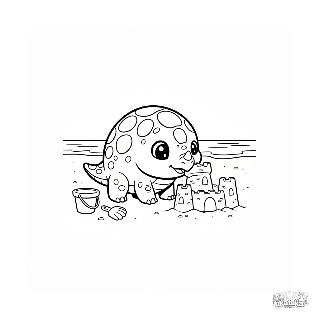 Página para colorir para crianças de 2-3 anos: um fofo filhote de anquilossauro brinca com um castelo de areia numa praia de oceano antigo. Formas grandes e simples com margens amplas.