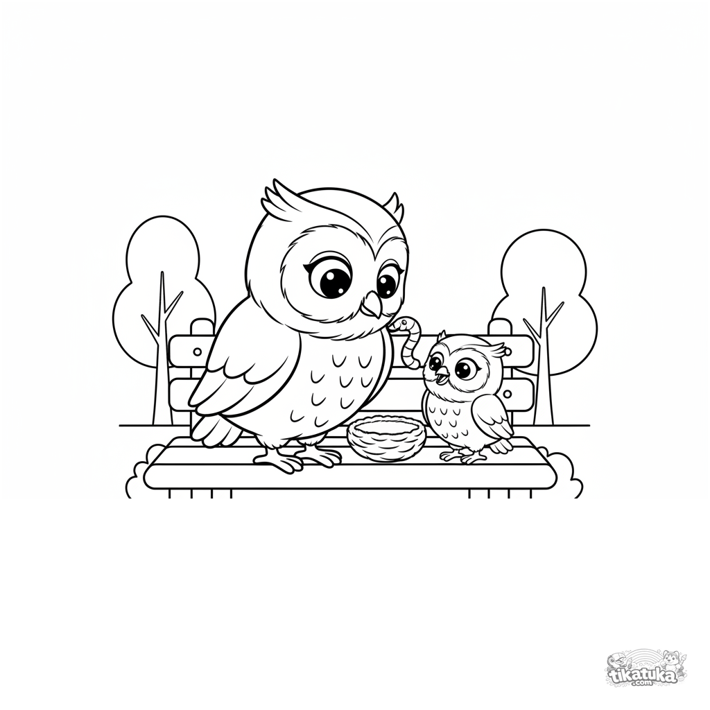 Página muito simples para colorir para crianças pequenas 2-3: uma coruja gentil alimenta um filhote minúsculo no banco do parque. Formas grandes e claras.