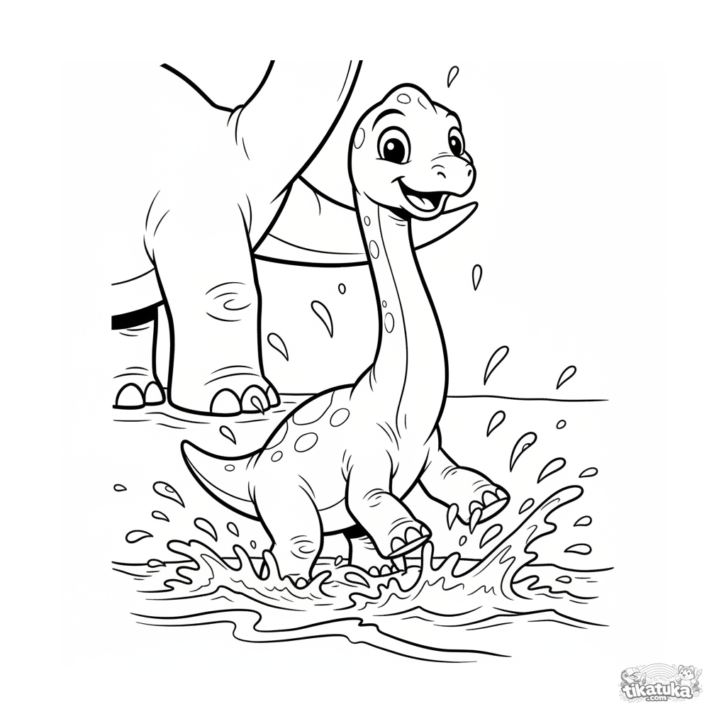 Página para colorir para 7-9 anos: um filhote alegre de braquiossauro brinca nas ondas de um oceano antigo. Cena dinâmica e expressiva.