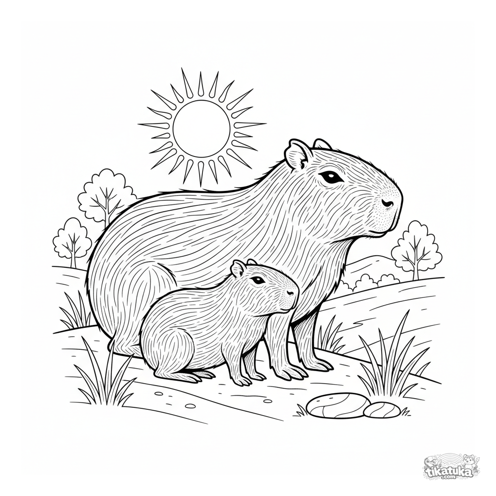 Página realista para colorir para crianças de 10-12 anos: um filhote de capivara e seu pai observam o pôr do sol em uma encosta.