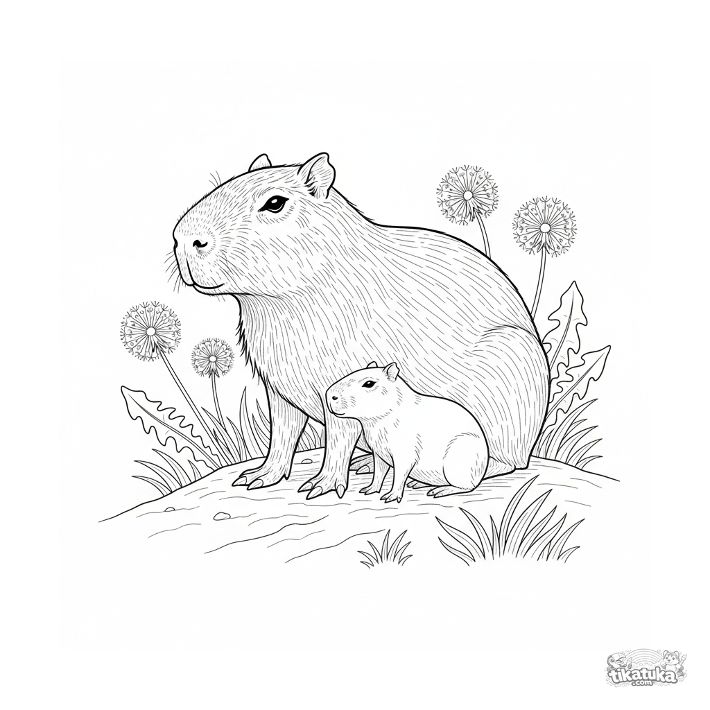 Uma página para colorir de Capivaras e relax com nível Difícil. Ela combina com a idade 10+ anos, imprime bem em casa e abre imediatamente no modo online.
